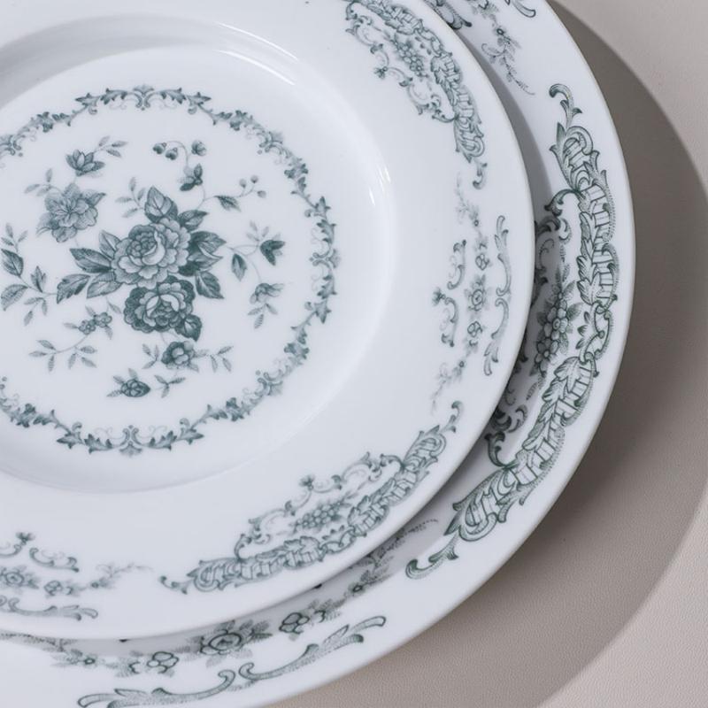 The white ceramic background of the tableware provides the perfect canvas for the captivating retro rose green design. The simplicity of the white background allows the intricate applique pattern to shine, drawing attention to the exquisite craftsmanship.