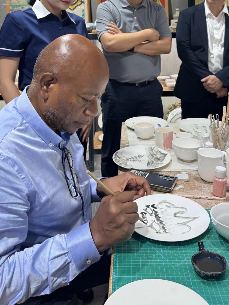 During the visit, Colombian Consul General Makanaky expressed great interest in the ceramic works displayed by PITO, especially after experiencing blue and white ceramic printing, and highly appreciated its exquisite craftsmanship and unique artistic value. The Consul General also tried hand-pulled embryo production himself, and under the guidance of the designer, he experienced the unique charm of traditional Chinese ceramic handicrafts. Afterwards, Colombian Consul General Makanaky had an in-depth discussion with Mr. Xu Hongsheng, Chairman of PITO. The two sides had extensive discussions on the possibility of ceramic cultural exchanges, artistic cooperation and trade development between the two countries.