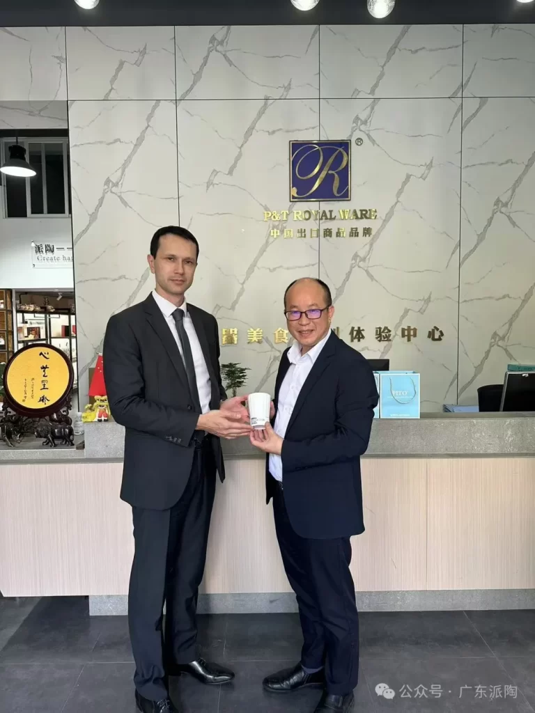 “China-France Environmental Month” event, PITO showcased its environmental innovation achievements. PITO Chairman Mr. Xu Hongsheng presented Mr. Olivier Ngo, Consul for Science and Higher Education at the French Consulate General in Guangzhou, with a specially designed commemorative cup from the Bocuse d’Or competition. This gift symbolizes the deep connection between China and France in both culture and fine ceramics.