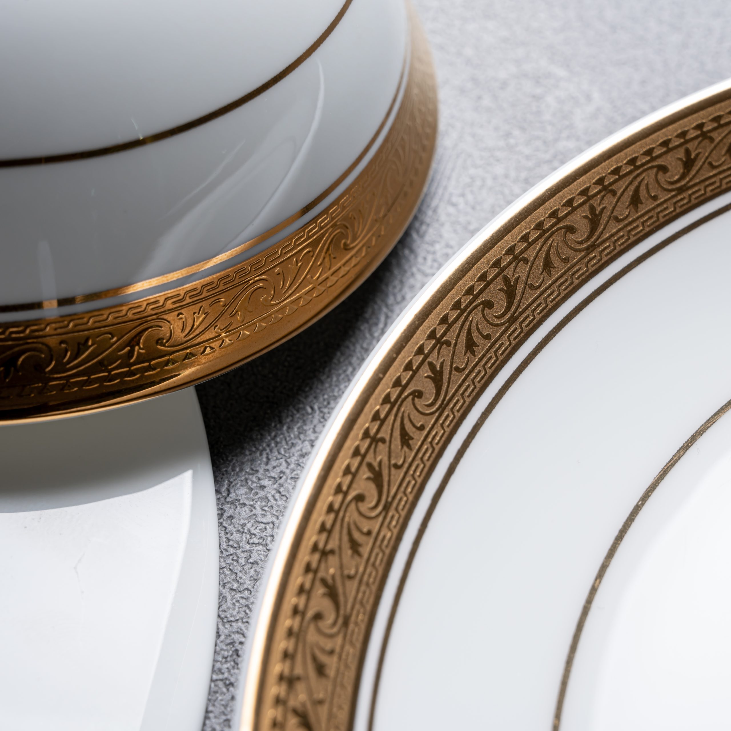 Rozpieść swoich gości kwintesencją luksusowej kolacji dzięki naszej wykwintnej zastawie stołowej z porcelany kostnej ozdobionej misternymi naklejkami,