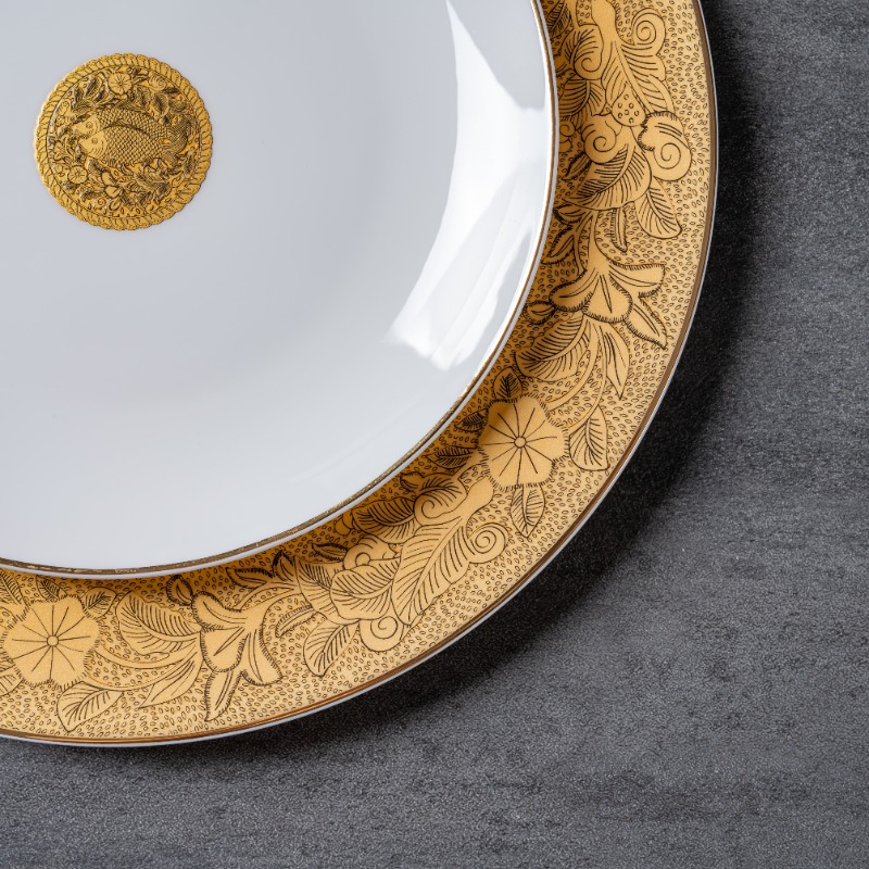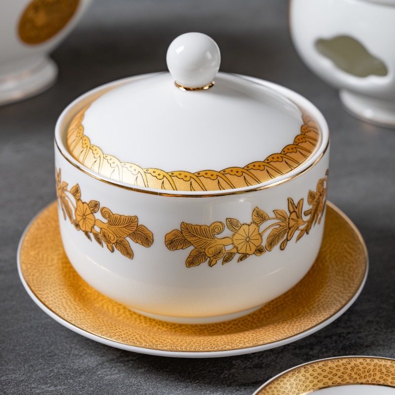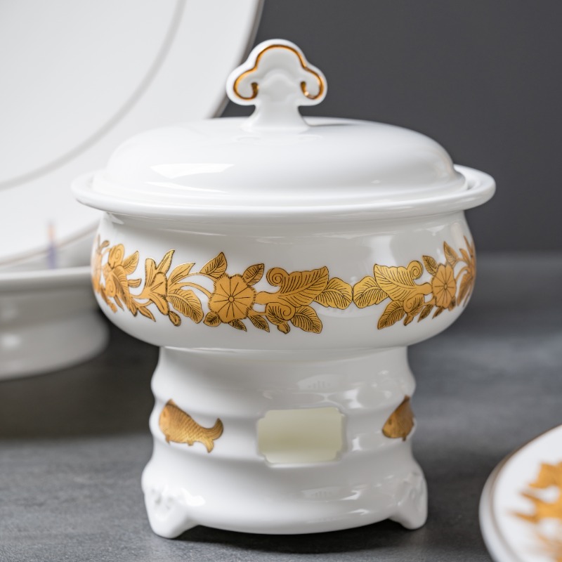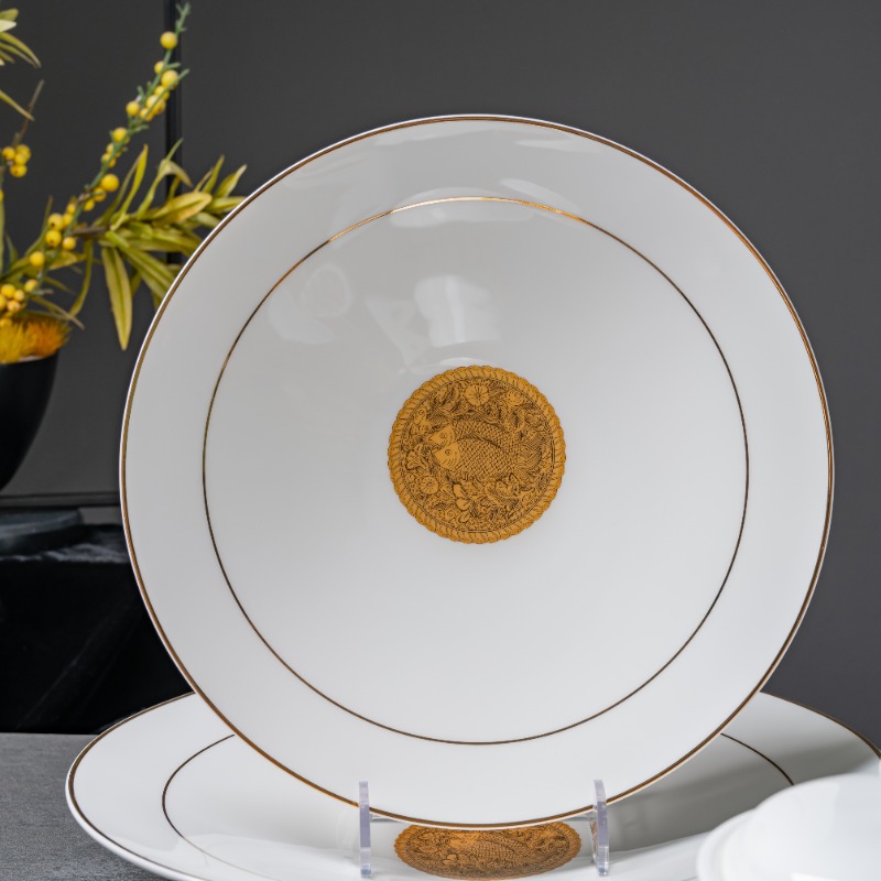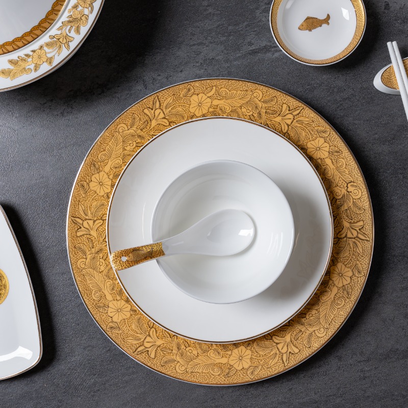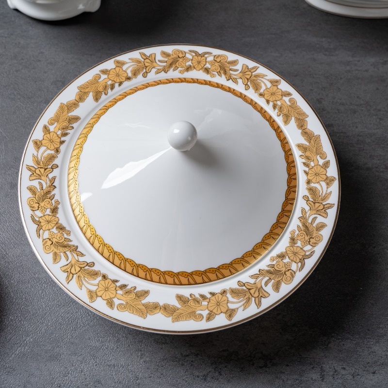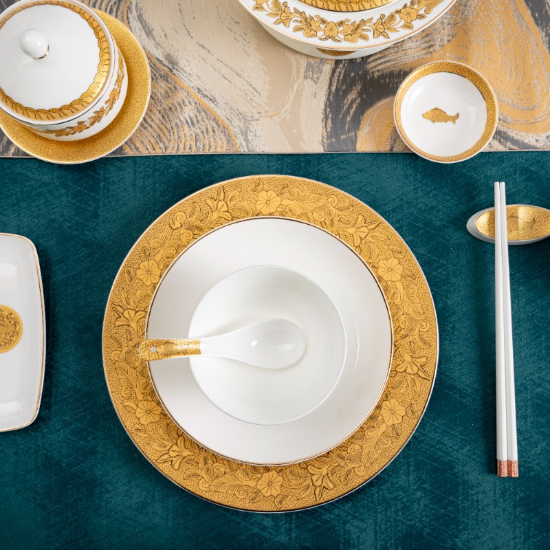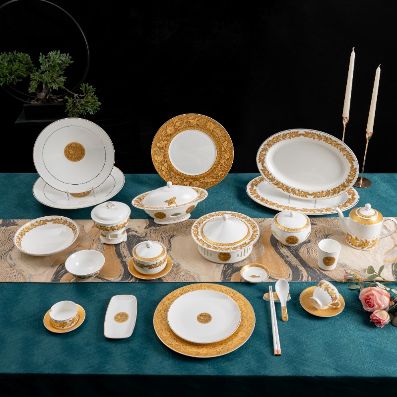 Indulge your guests in the epitome of luxury dining with our exquisite bone china dinnerware adorned with intricate decals,