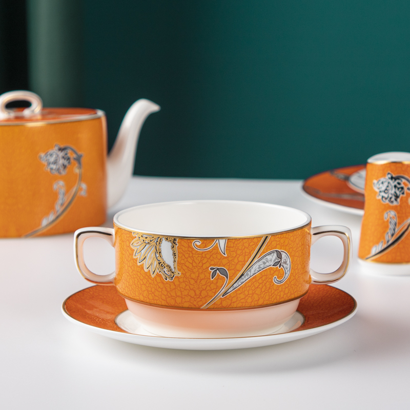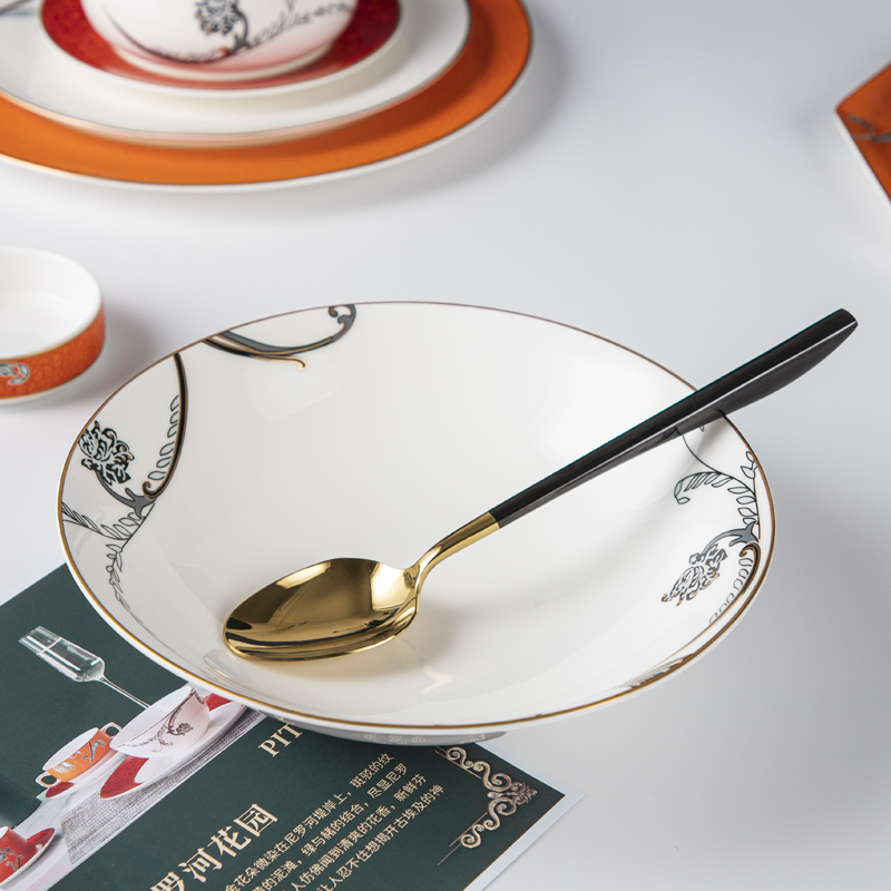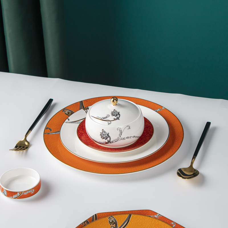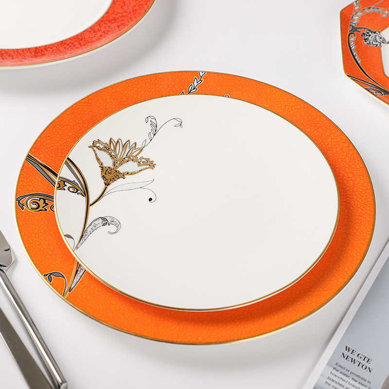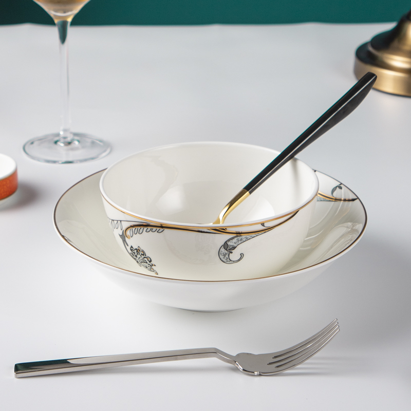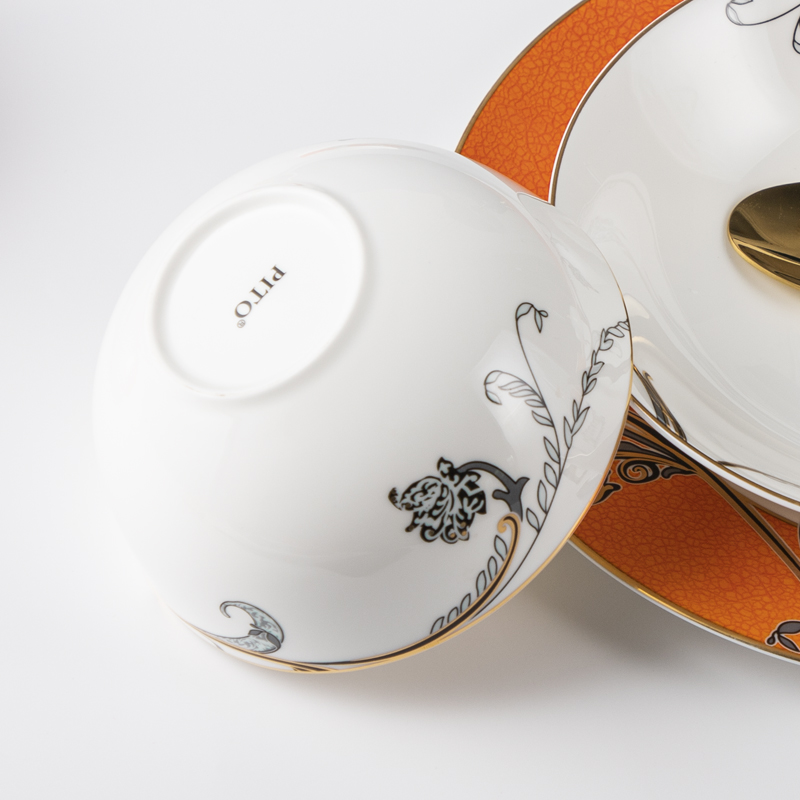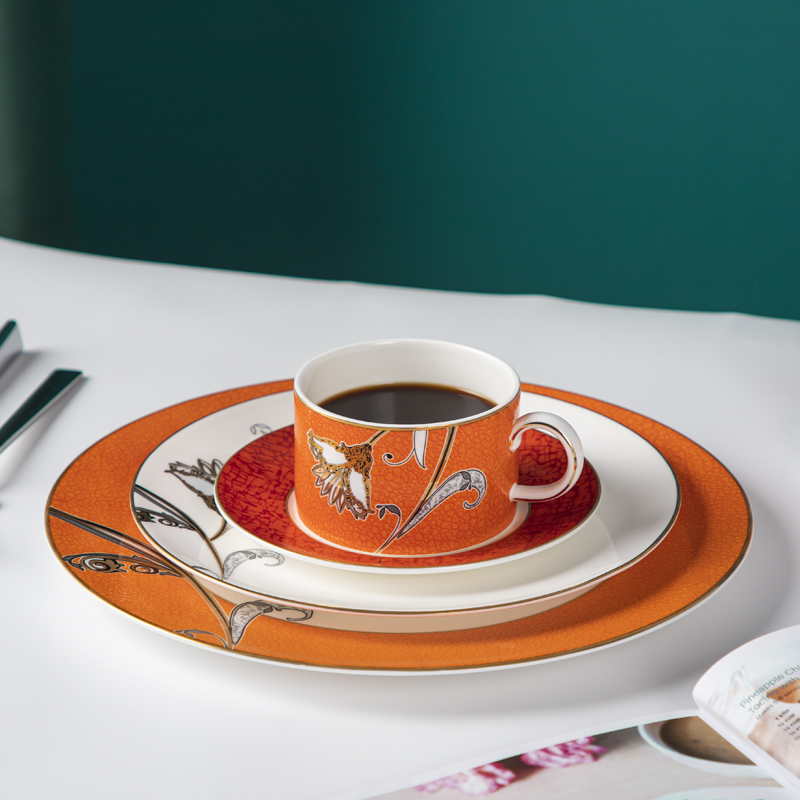 Indulge your guests in the epitome of luxury dining with our exquisite bone china dinnerware adorned with intricate decals,