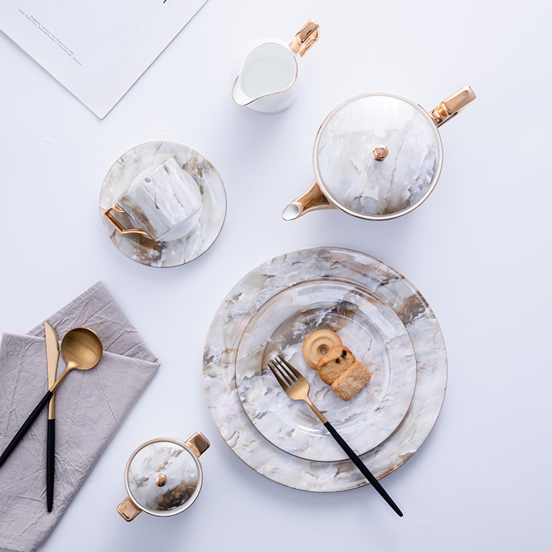 Indulge your guests in the epitome of luxury dining with our exquisite bone china dinnerware adorned with intricate decals,