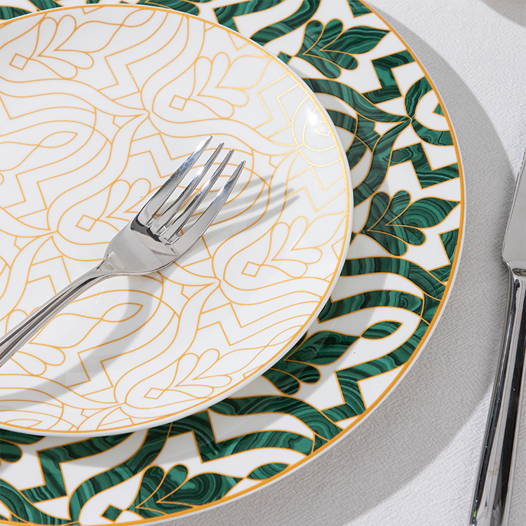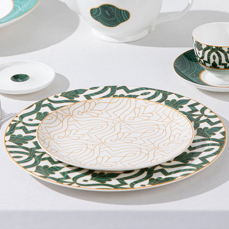 Indulge your guests in the epitome of luxury dining with our exquisite bone china dinnerware adorned with intricate decals,