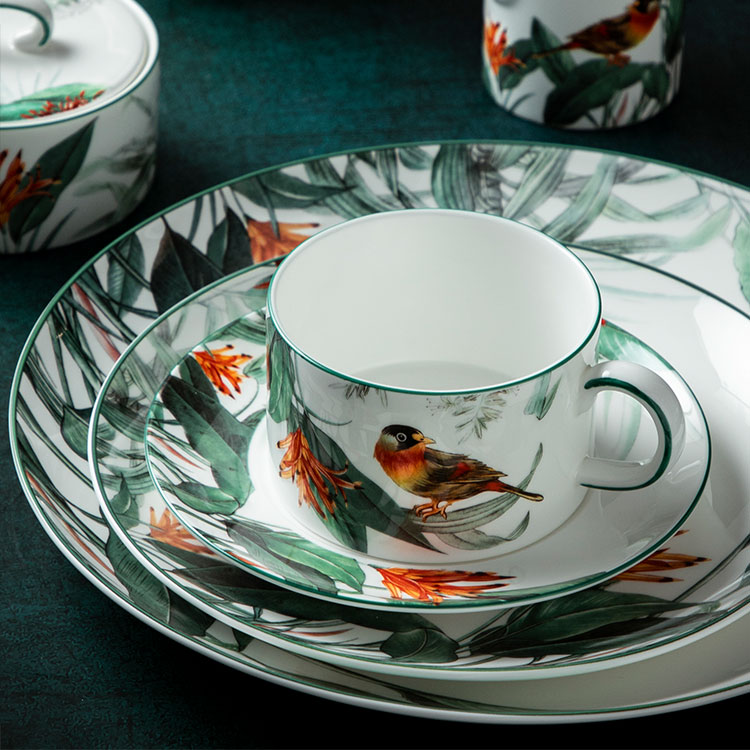 Indulge your guests in the epitome of luxury dining with our exquisite bone china dinnerware adorned with intricate decals,