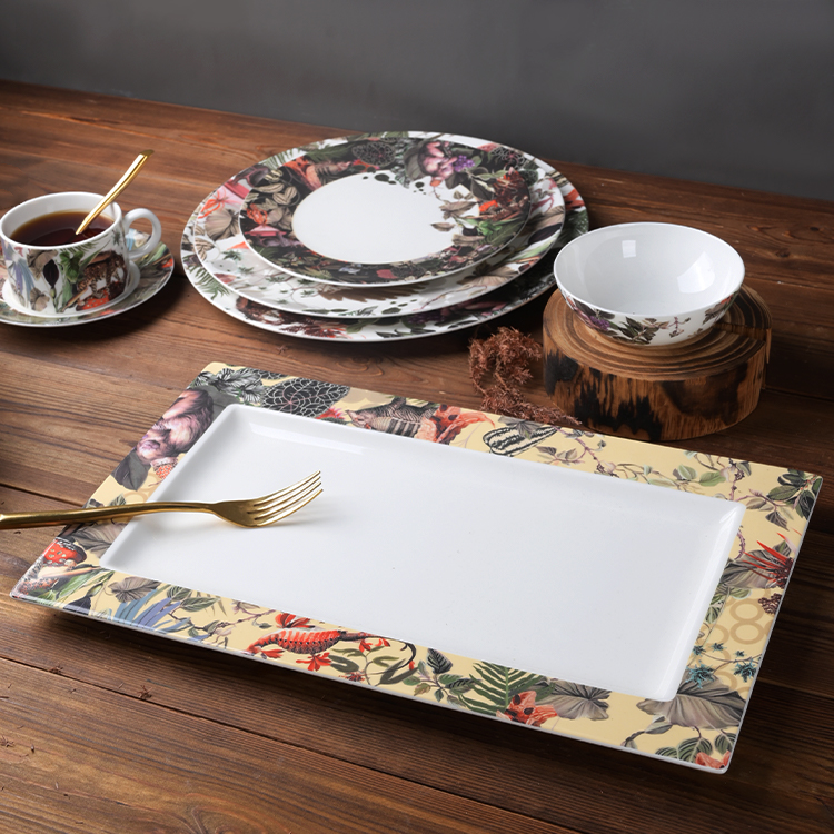 Indulge your guests in the epitome of luxury dining with our exquisite bone china dinnerware adorned with intricate decals,