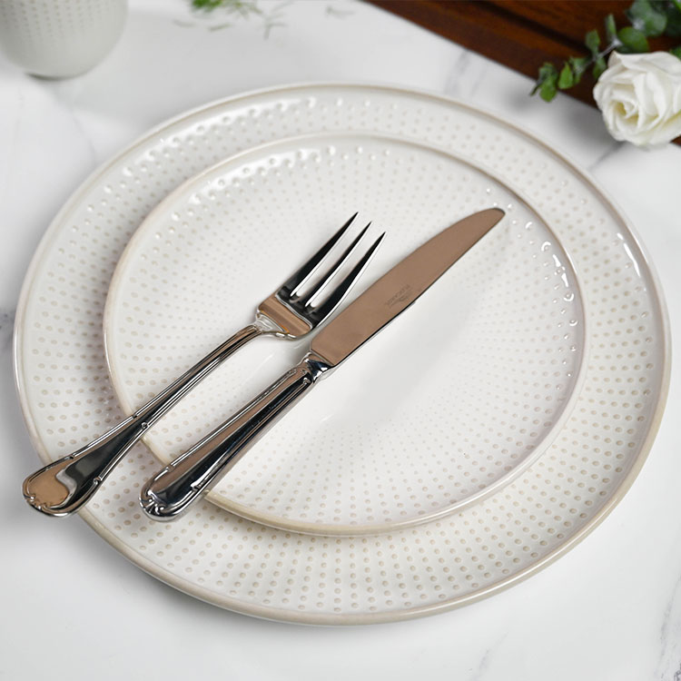 - Pearl Dot, an elegant high temperature porcelain dinnerware features a pure white glaze adorned with delicate pearl-like dots.