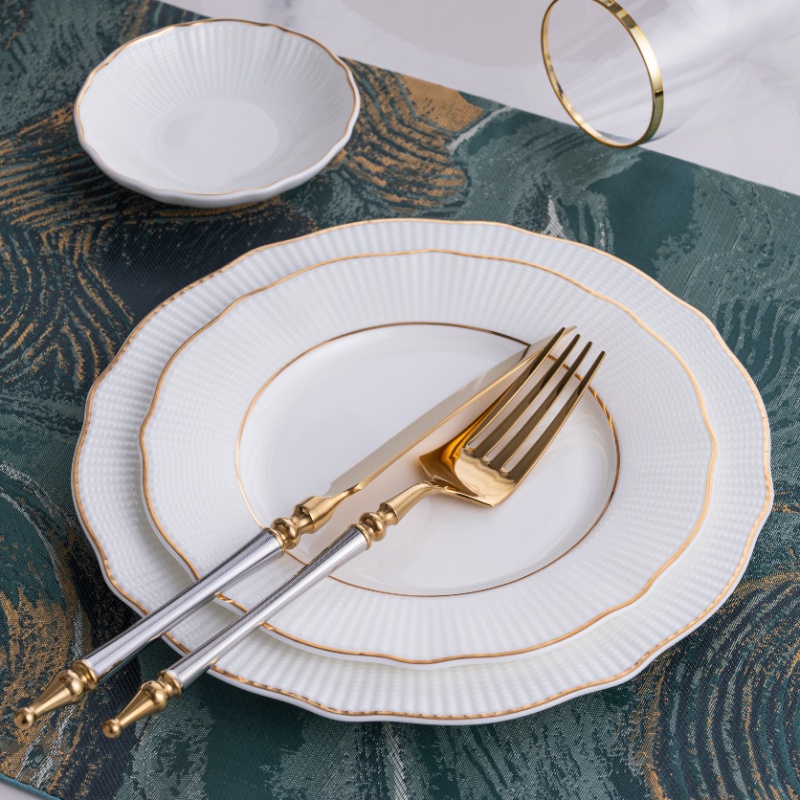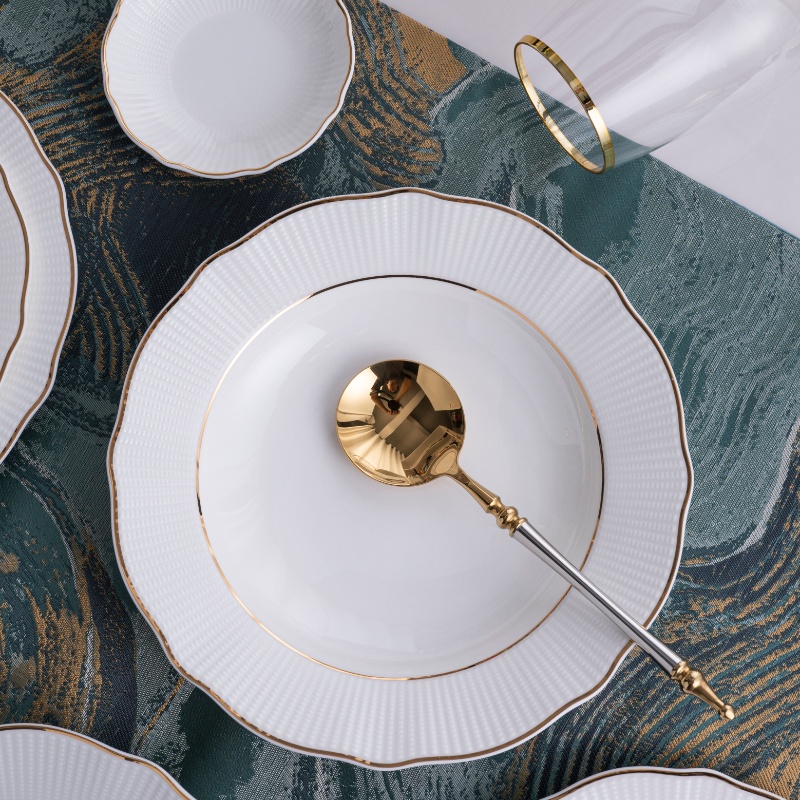 Indulge your guests in the epitome of luxury dining with our exquisite bone china dinnerware adorned with intricate decals,