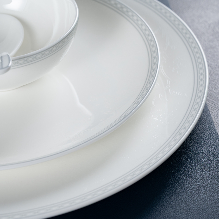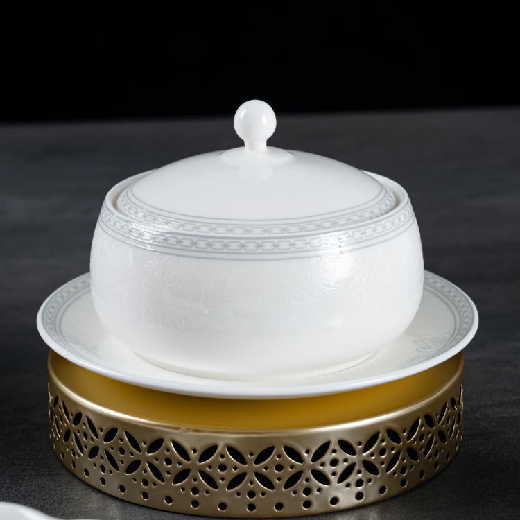 Indulge your guests in the epitome of luxury dining with our exquisite bone china dinnerware adorned with intricate decals,