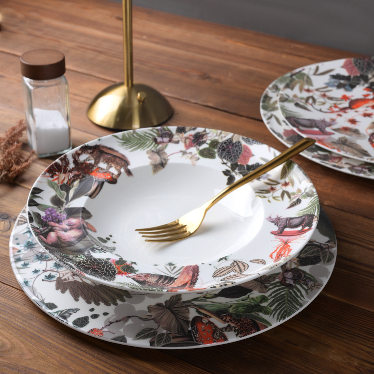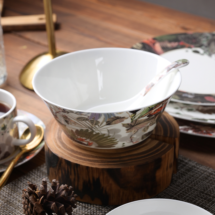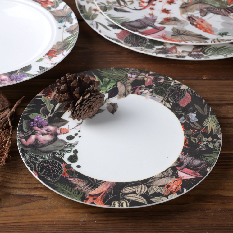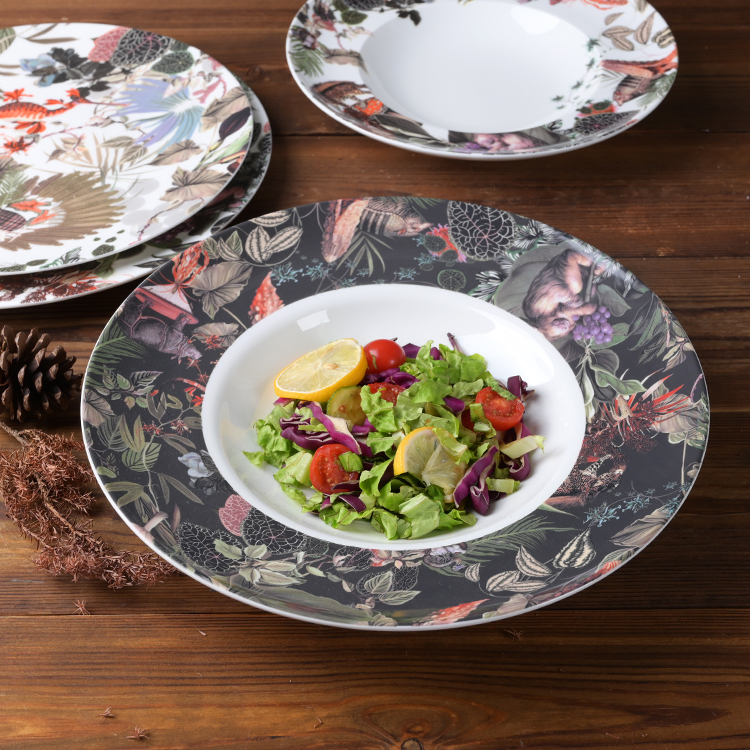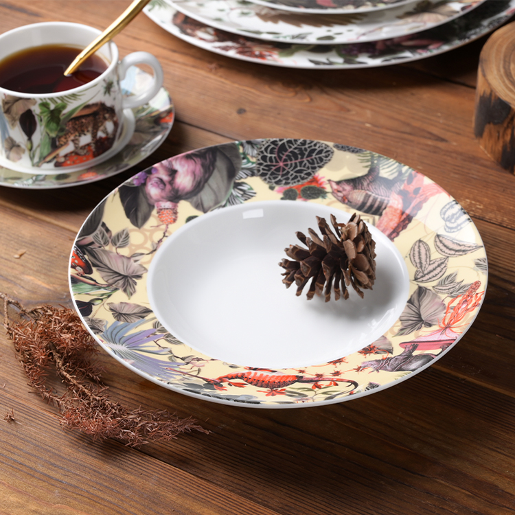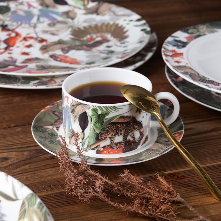 Indulge your guests in the epitome of luxury dining with our exquisite bone china dinnerware adorned with intricate decals,