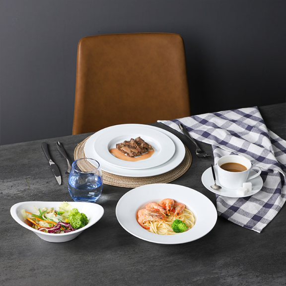 Royal white porcelain serves as a pristine canvas for culinary expression. Its neutral whiteness highlights texture and color, supporting sophisticated plating across Western, Asian, and fusion cuisines. You can use these plates for breakfast buffets, fancy dinners, or even a quick lunch.